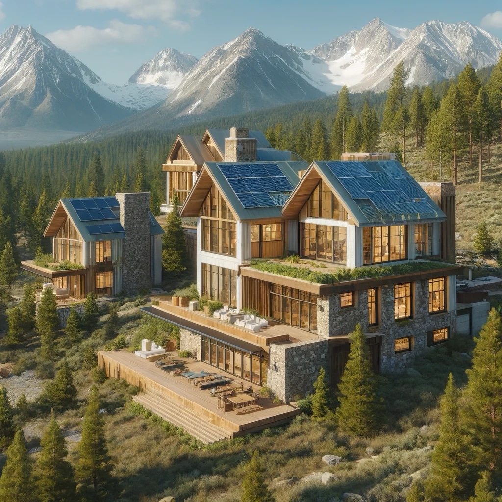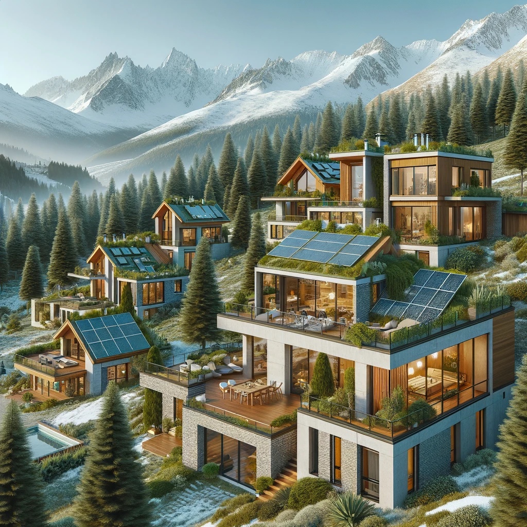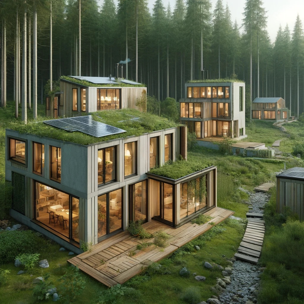 Features: Energy: Solar panels and wind turbines for power generation. Battery storage system for energy. Optional geothermal heating and cooling systems.Water: Rainwater harvesting system integrated with a purification system. Greywater recycling system for irrigation and non-potable uses.Food Production: Hydroponics and aquaponics systems for year-round food production. Dedicated space for vertical farming.Waste Management: Composting toilets. Biogas plant for organic waste conversion into energy.Architecture: Modular design with expandable sections. Use of sustainable materials like bamboo, recycled steel, and green concrete. Large, insulated windows for natural lighting and passive solar heating.Technology: Smart home systems for efficient resource management. AI-driven resource allocation and monitoring system.Location: Designed to be adaptable to various terrains and climates, from rural areas to urban rooftops.Design Aesthetics: Modern and minimalist, emphasizing open spaces and natural light. Green roofs and living walls to enhance biodiversity and insulation.Community Integration: Capabilities to connect with other similar units to share resources and data, creating a networked micro-community.