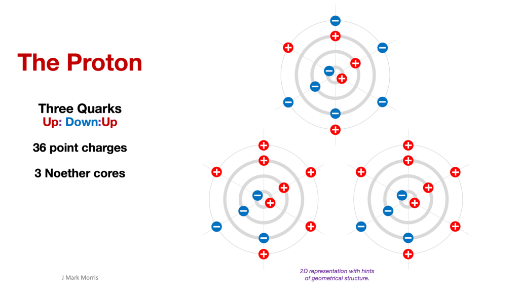 - Quark Structure: The quarks in the proton are described as having a complex internal structure, represented in this discussion by a model called the “2-2-2-6 structure.” This includes something called a Noether core, which is a tri-binary (three-part) structure within each quark, possibly relating to how quarks generate their properties and interact.
